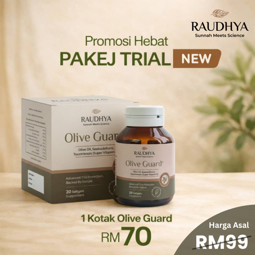 Raudhya OliveGuard+ Diperkaya Bahan Aktif Polyphenols, Tocotrienols (Super Vitamin E) & Omega Aktif Menyokong Kawalan Gula, Kolesterol & Tekanan Darah